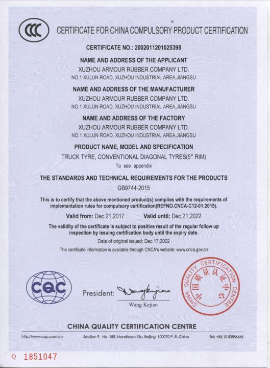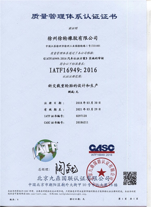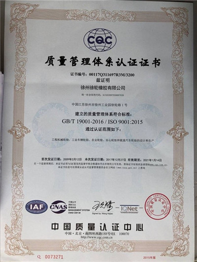 质量是企业的生命,是企业得以生存和发展的基础。公司自2006年创办以来,徐轮橡胶就是一直对产品品质孜孜以求,精益求精。以“质量是生命 科技求领先 过程零缺陷 服务到永远”为质量方针,徐州徐轮橡胶有限公司建立健全了科学完善的质量保证体系,自2009年起先后通过了ISO9001-2008、CCC、美国DOT、欧洲E-mark等质量体系认证。